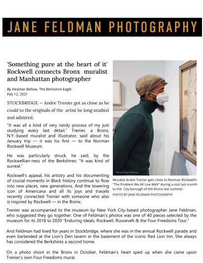 This feature from The Berkshire Eagle brings together photographer Jane Feldman and Bronx muralist Andre Trenier through their shared admiration for Norman Rockwell and the ideals behind the Four Freedoms. The article follows the artists during a visit to the Norman Rockwell Museum and reflects on how Rockwell’s work continues to inspire new generations. Feldman’s photographs of Trenier’s murals and their time working together are included in the story, along with discussion of both artists’ backgrounds and their dedication to work rooted in history, human rights, and lived experience. The piece captures a meeting of two artists from different worlds whose work connects through a common belief in the power of art to tell human stories.